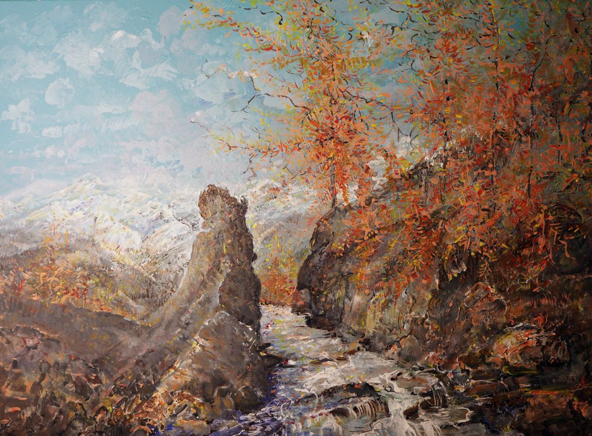 Górski pejzaż z modrzewiami-akryl-70x100-podobrazie,płótno-Kańtoch Mirosław ARTMI
