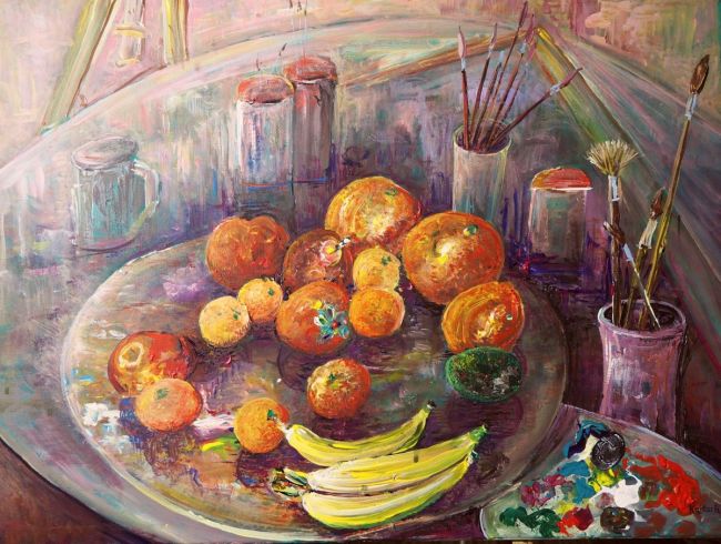Martwa natura,stolik malarza z owocami-akryl-60x80-podobrazie,płótno-Kańtoch Mirosław ARTMI