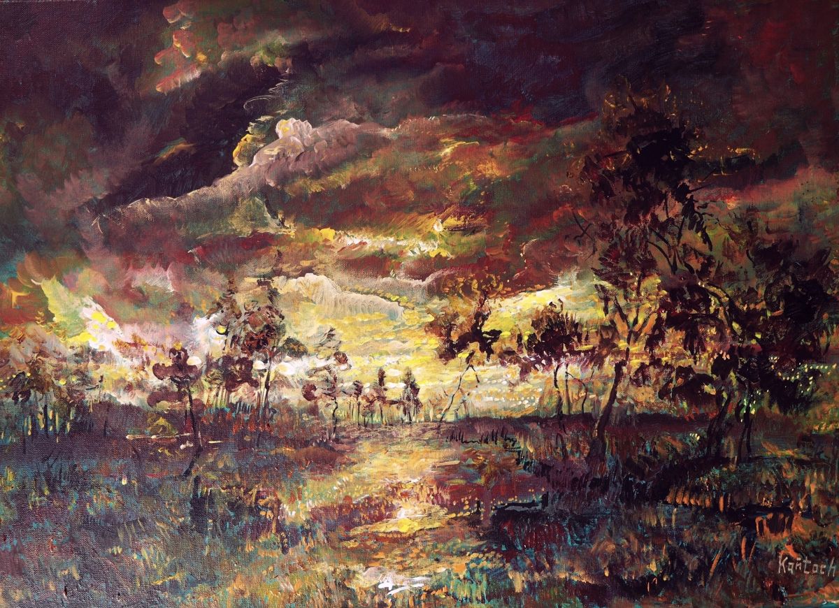 Impresja,zachód słońca-akryl-70x50-podobrazie,płótno-Kańtoch Mirosław