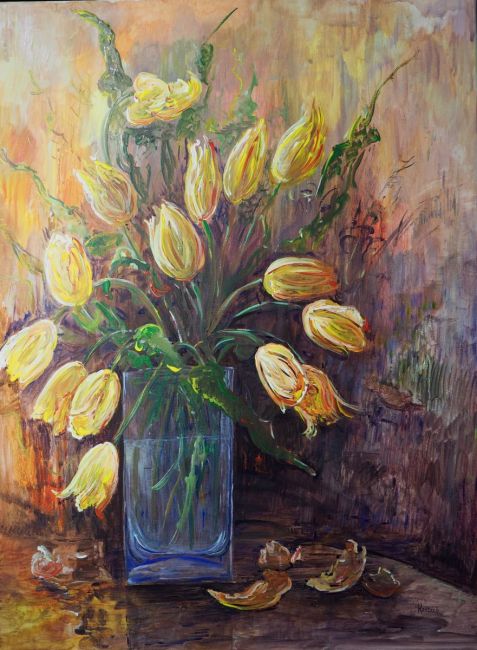 Żółte tulipany w szklanym wazonie-akryl-80x60-podobrazie,płótno-Kańtoch Mirosław ARTMI